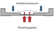 Der Überdruck erhöht sich und die Membran hebt sich an der einen Seite des Ventils bis sich ein Tunnel gebildet hat, durch den die Röstgase nach außen dringen können.